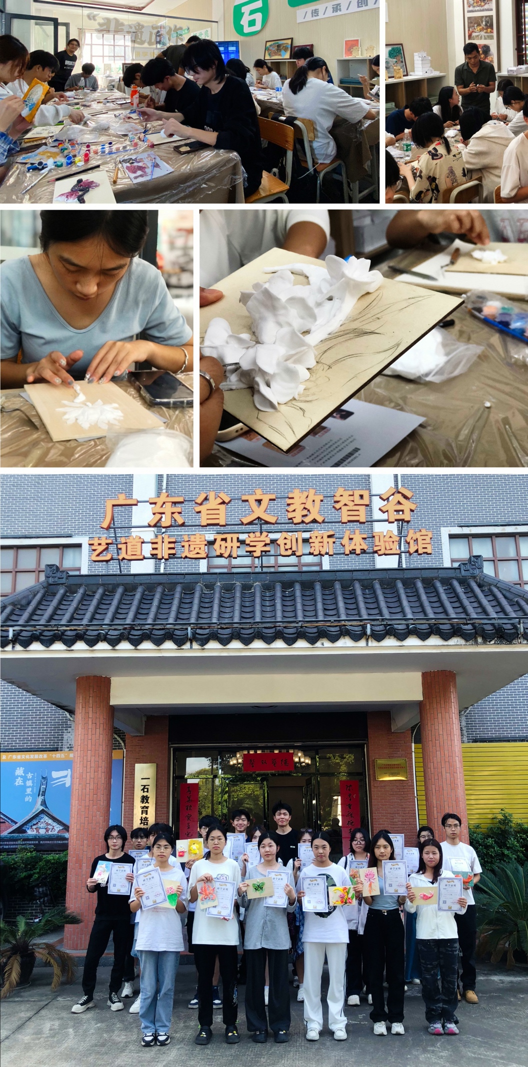 下午,师生们前往非遗研学体验馆,开启灰塑艺术的创作体验。灰塑作为岭南建筑装饰中的一种独特技艺,通过浮雕和半浮雕等形式,展现立体感与丰富的层次感,是广东民间艺术的瑰宝。学生们在专业老师的指导下,学习灰塑的基本技法,从泥土的捏制到细腻的雕刻,每一步都体现出对传统工艺的尊重与传承。通过灰塑的亲身实践,学生们不仅掌握了这项传统技艺的基本技能,也在创作过程中深刻体会到其背后所蕴含的文化价值。灰塑艺术题材多样,包括花鸟鱼虫、传统吉祥物等,每一个细节都传递着岭南人对自然与生活的敬意。学生们通过对这些题材的表现,感受到艺术与日常生活的紧密联系,也明白了非遗文化在当代艺术创作中的延续与发展。