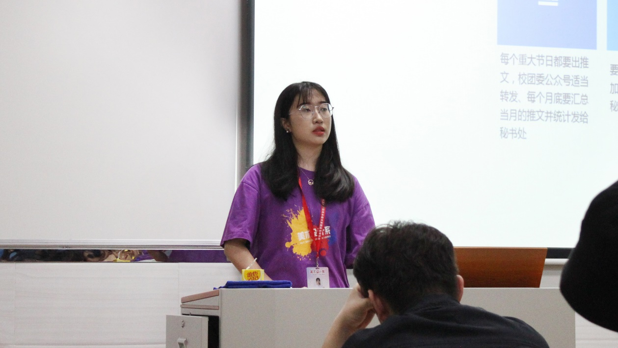 陈雪怡学姐结合上学期的工作情况,提出对新学期的工作要求和对新学期的未来展望。最后,还对美术学院团总支学生会本学期的活动做了简单介绍,并积极鼓励各部门踊跃开展活动。