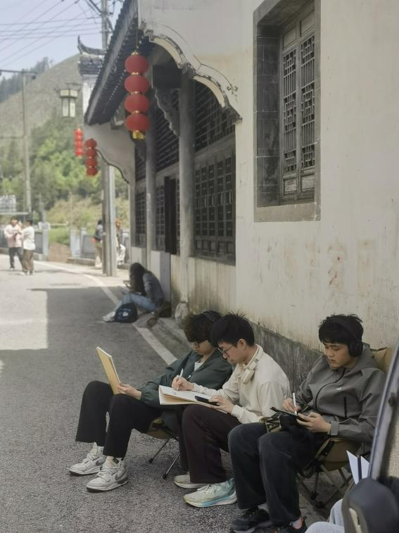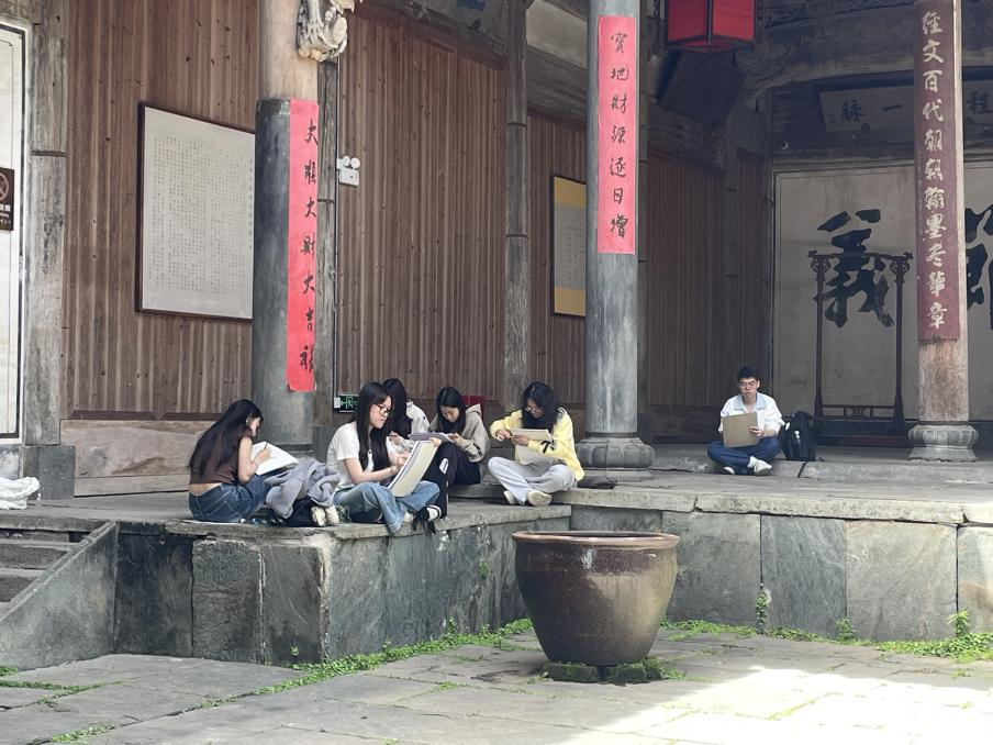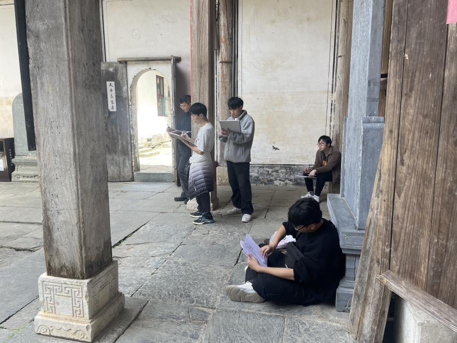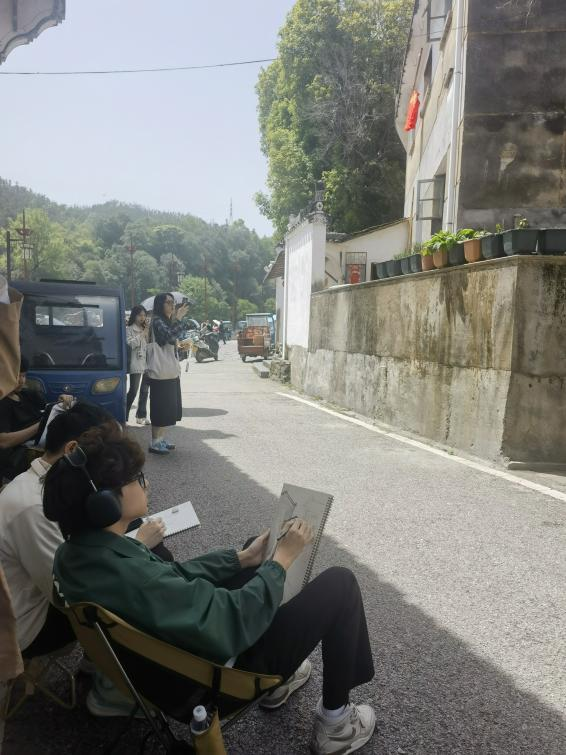 清晨薄雾中,古村白墙黛瓦与潺潺溪流相映成趣,师生迅速投入创作状态。带队教师以“在地文化的视觉转译”为切入点,引导学生观察古建筑肌理、空间层次与人文细节,通过速写、水彩、摄影及数字绘画等多媒介手段,提炼徽州美学元素。学生各自协作,围绕俞氏宗祠、曲径通幽的古巷等场景展开创作,青石板的纹路、飞檐翘角的线条韵律成为画面中的视觉焦点。