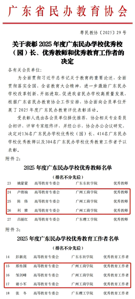 2025年9月15日,广东省民办教育协会2025年度优秀教师和优秀教育工作者评选结果正式揭晓。beat365六位优秀教师凭借卓越业绩和突出贡献,在全省民办教育工作者中脱颖而出,斩获殊荣。卢倩楠、陈伟、利雅三位老师被授予“广东省民办学校优秀教师”称号;邢传国、邹剑峰、谢小军三位老师荣获“广东省民办学校优秀教育工作者”称号。