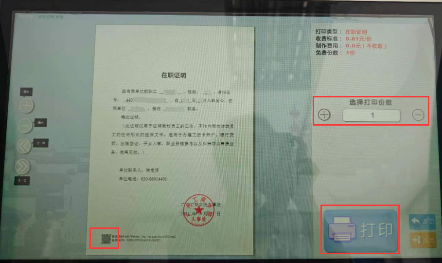 3.如果信息无误,选择打印份数,点击“打印”生成纸质版;若需要电子版证明,可扫证明左下角的二维码获得电子版及验证(图四)。