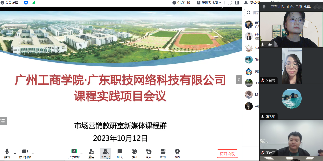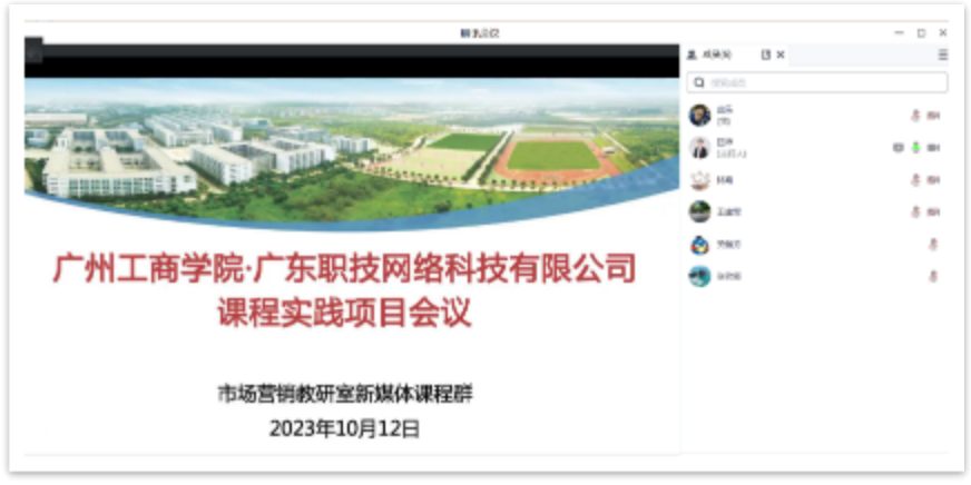 为促进新媒体类课程产教融合,提高课程创新水平,助力学生在实践方面的成长,10月12日晚,在市场营销教研室王建军主任的带领下,新媒体课程群部分教师与广州职技网络科技有限公司相关负责人共同在线上召开了合作研讨会议。本次会议由新媒体课程群林霞老师主持,吕沛老师作为企业联络负责人组织与会人员。