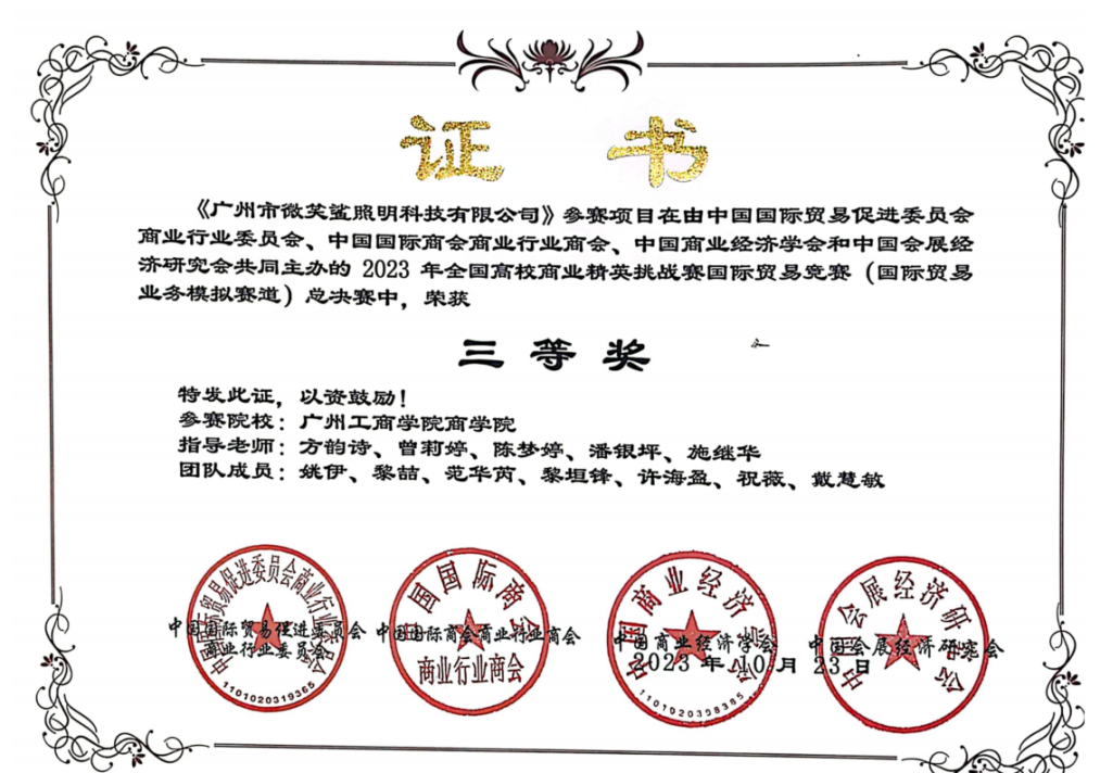 商学院国际经济贸易教研室自大赛启动以来,从个人知识竞赛、报名组队到赛前讨论和培训指导,老师们带领团队学生制定了详细的参赛计划和指导方案。竞赛期间,参赛组成员克服了种种困难,积极探讨、完成竞赛。并在比赛中充分发挥了自己的专业技能,各成员紧密合作,共同解决了各种复杂的营销决策问题。总决赛的参赛队伍选用广州市微笑鲨照明科技有限公司的户外露营风扇灯作为参赛核心产品,通过撰写参展计划书、设计展位海报、模拟产品新闻发布会和组织现场贸易谈判等赛事活动内容,使得学生不仅对产品的生产、设计、宣传、销售等各环节有了全面的了解和认识,还对国际贸易理论知识与实务操作有了更深入的理解和感悟。