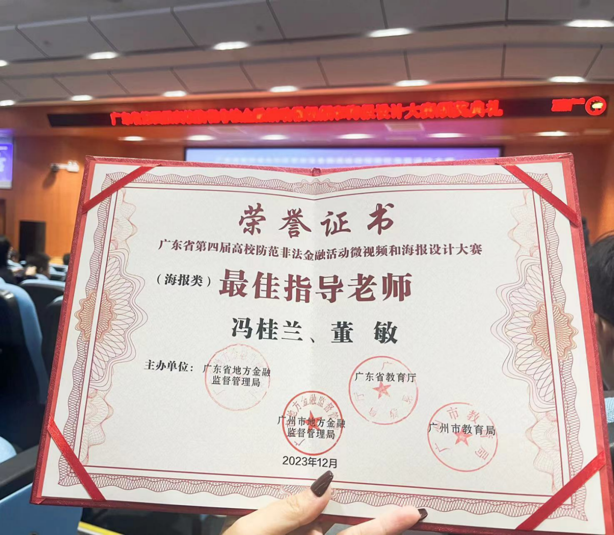 广东省第四届高校防范非法金融活动微视频和海报设计大赛于12月21号圆满落幕。商学院电子商务教研室冯桂兰老师、董敏老师指导的学生郭秋婵的《拒绝诱惑陷阱》作品在众多优秀作品中脱颖而出,荣获特等奖并获得奖金10000元。同时,冯桂兰老师和董敏老师也荣获最佳指导老师的殊荣称号。