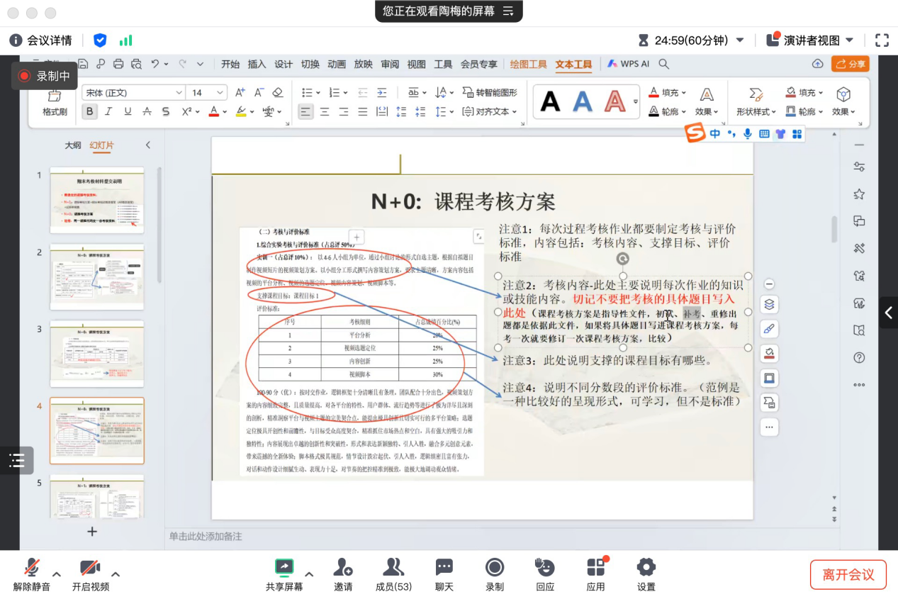 会议围绕期末试卷的编制、审定及相关工作进行了深入讨论和安排。陶梅教授首先对本学期的N+0课程的考核方案工作进行了布置和提醒,并指出,期末考核不仅要考查学生的理论知识掌握情况,还要注重对学生实际操作能力的评价。大家需要明确,课程考核方案是一份指导性文件,学生的初试、补考、重修出题都是依据此文件,因此需要谨慎对待。