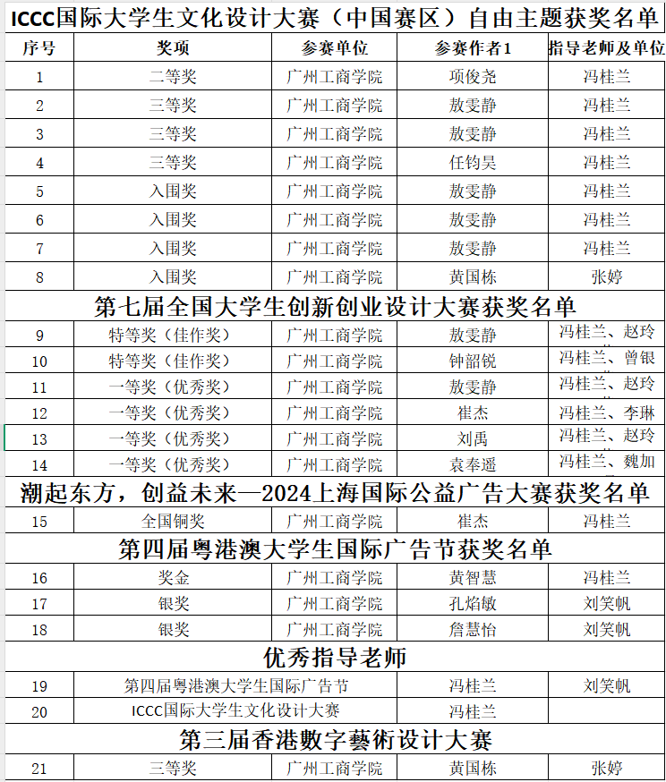 2024年寒假期间,商学院电商教研室《网络广告策划与设计》课程以赛促教成果丰硕,34位同学累计斩获国内外大奖21项。在第四届粤港澳大学生国际广告节中,冯桂兰老师指导的黄智慧团队荣获国家级金奖,刘笑帆老师指导的孔焰敏团队、詹慧怡团队分别荣获国家级银奖两项。在ICCC国际大学生文化设计大赛(中国赛区)中,冯桂兰老师指导的任钧昊等团队荣获国家二等奖、三等奖3项,在第三届香港数字艺术设计大赛,张婷老师指导的黄国栋团队荣获三等奖。在第七届全国大学生创新创业设计大赛中,冯桂兰老师指导的袁奉遥等团队荣获国家特等奖、一等奖6项。同时,冯桂兰、刘笑帆老师在第四届粤港澳大学生国际广告节设计大奖中荣获全国优秀指导老师奖、冯桂兰老师在ICCC国际大学生文化设计大赛(中国赛区)中荣获全国优秀指导老师奖。
