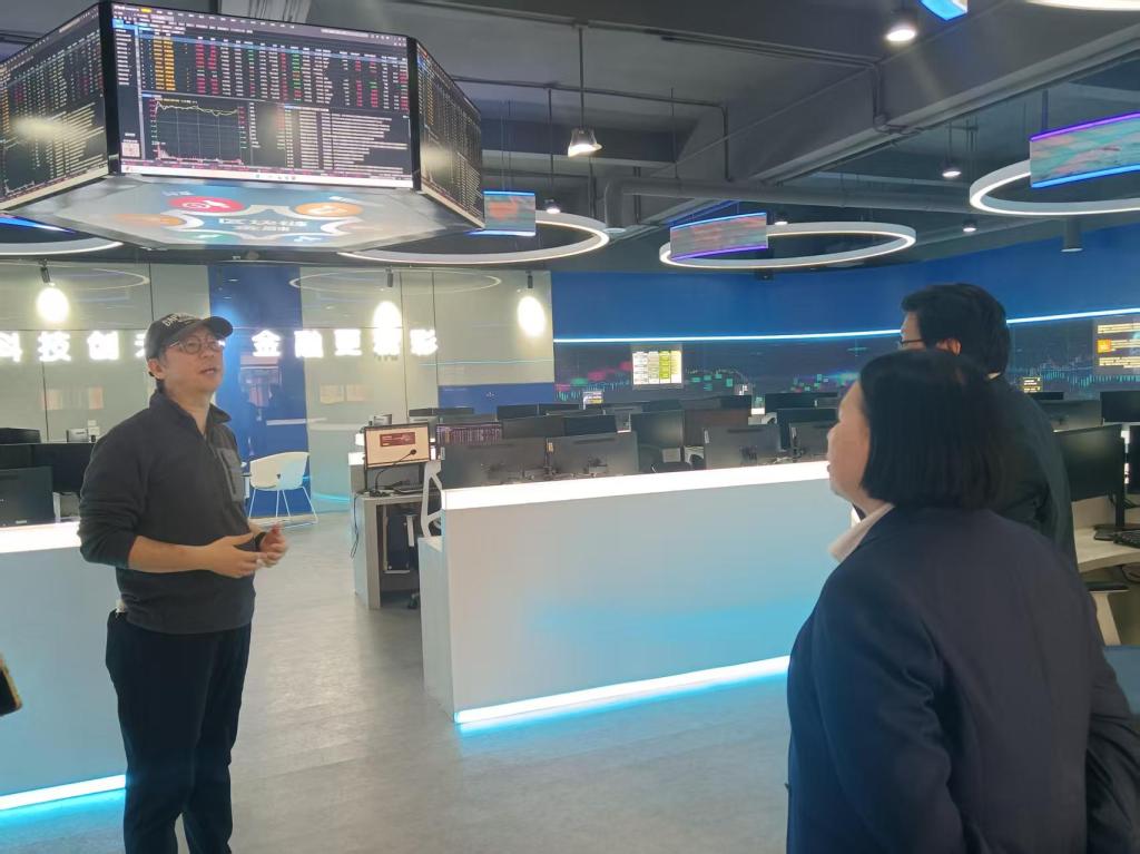 随后,钟教授带领投资学教研室一行参观了数字金融实验中心。实验中心配备同花顺IFIND数据终端、万得WIND数据终端等7个高端金融数据分析软件,以及金融数据挖掘与分析平台、区块链金融创新实训平台等16个财经类教学软件,支撑金融机构仿真运营、金融ERP、仿真交易与投资分析、家庭财富管理、金融科技创新等7个实验课程模块。同时,以数字金融实验中心为依托,建立起广东华商金融科技研究院(学校唯一省级智库平台)、广东乡村振兴金融研究中心(广东省普通高校人文社科重点研究基地)等研究机构以及数智金融产业学院、金融科技与数字经济产业学院等产教融合机构。以数字金融实验中心为基础,培育省级教育教学标志性成果,完成省级一流课程《国际金融》的建设,与深圳点宽网络科技有限公司共同申报教育部产学合作协同育人项目。下一步的建设思路是,通过与金融科技企业共建联合实验室,学生完成企业真实项目锻炼实操技能,同时提升社会服务的能力,学校在金融行业的影响力也将进一步提升。