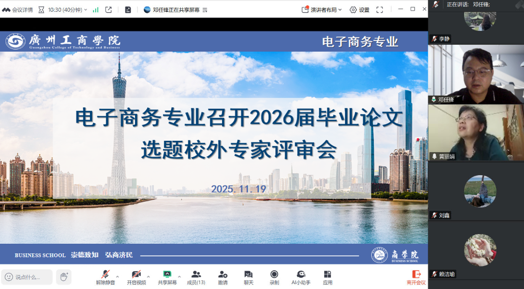为确保2026届毕业论文选题的专业性、实践性与学术价值,电子商务专业11月19日以腾讯线上会议形式召开毕业论文选题校外专家审核会。会议特别邀请广东省电子商务教学指导委员会副主任广州大学黄丽娟教授担任外部评审专家。电子商务专业负责人邓任锋副教授及教研室梅思阳主任、刘鑫、赖洁瑜、易巧、陶梅、冯桂兰、李静等专业教师共同参会,从严把控选题质量。
