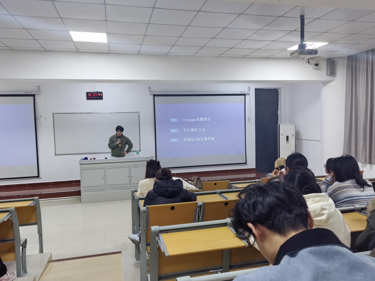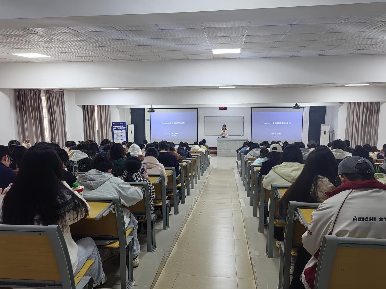 培训现场,曹主任在开场致辞中强调了调研能力在学术研究与实践应用中的重要性,鼓励同学们珍惜本次培训机会,认真学习实操技巧,将调研工具熟练运用到学习与竞赛中,不断提升自身综合素养。随后,余宗桓老师围绕培训核心模块,结合丰富的实操案例,系统讲解了Credamo见数平台的全流程操作方法,从问卷设计的规范与技巧、数据收集的高效策略,到数据清理、建模分析的核心逻辑,均进行了细致拆解。
