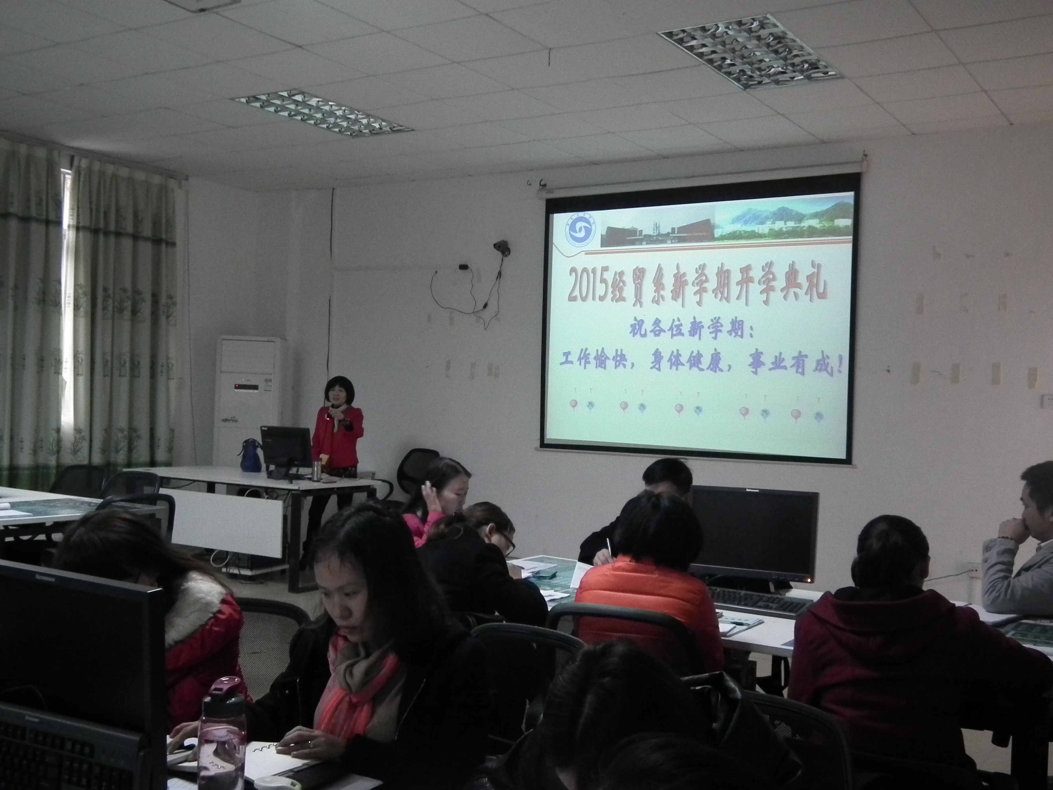 2015年3月6日上午,经济与贸易系在经管楼106室召开新学期第一次系部会议,经济与贸易系易露霞主任、马超平副主任及经贸系全体教职工参加会议。
