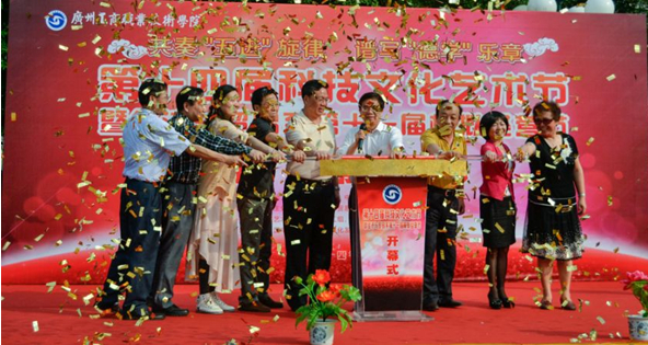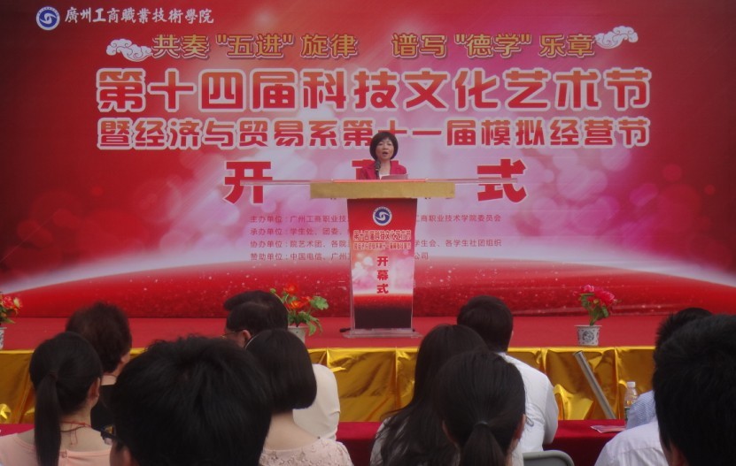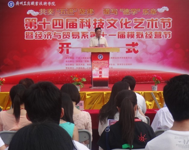 2014年5月14日的下午,天公作美,晴空万里,在“五进”之歌的激昂旋律衬托下,由经济与贸易系团总支学生会联合院团委一同举办的第十四届科技文化艺术节暨经济与贸易系第十一届模拟经营节的开幕式在文化广场拉开帷幕。出席本次开幕式的嘉宾有广州工商职业技术学院院长邝邦洪教授、党委书记钟伟强同志、经济与贸易系主任易露霞教授以及各系主任和学工组代表。