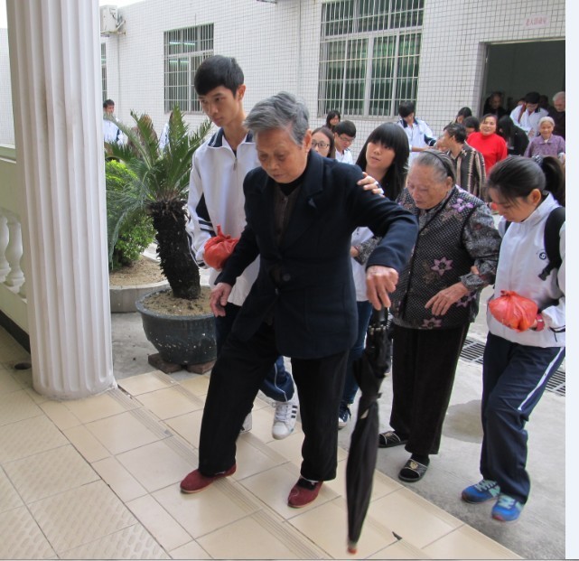 志愿者搀扶着老人