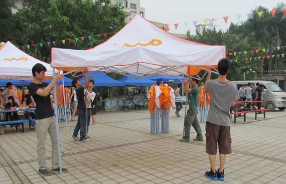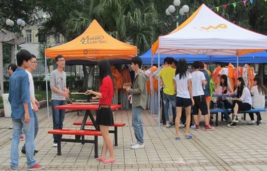 登记、取物资、撑帐篷、摆座椅… …所有人都忙得不亦乐乎,同学们都热情高涨地为“模拟经营节”做精心准备,如何装饰店铺,需要哪些物品等等,每个团队人员都配合融洽,大家忙碌并开心地为自己店铺贡献一份力量。2013年4月24日这天,上午9:00到下午16:00,陆续来到场地的摊主在咨询台登记后,娴熟地从团总支学生会工作人员手中接过物资,便开始了这场隆重活动的准备工作,很快整个文化广场都洋溢着一股热火朝天的干劲。