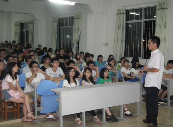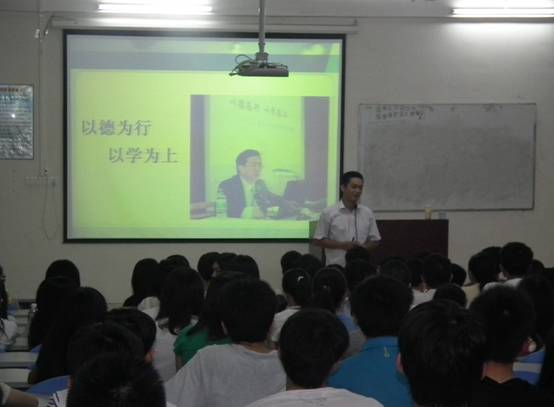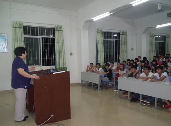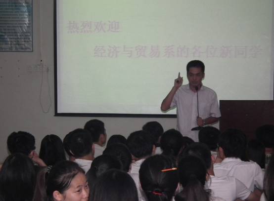 首先,我系马超平副主任代表我系热烈地欢迎经济与贸易系的各位新同学。同时马超平副主任向新生介绍我系两大品牌:一是我系的市场营销专业是2012年广东省第一批省级高职教育重点培育建设专业,是众所高职院校中唯一获此殊荣的;二是我系的实验实训室的硬件设备齐全。目的是激发同学们学习的热情。
