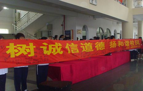 接着进行以班级为单位的签名活动,新生代表们都积极踊跃地在“树诚信道德,扬和谐校风”的横幅上签名。其中许多学生干部也亲自签名,以示对这项活动的高度重视。