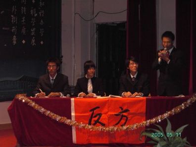 【本网讯】2009年12月3日晚上7:15,商贸信息管理系和物流与公共事务管理系辩论决赛在实验楼105举行,辩论的主题是在教育方面应注重知识教育还是人格教育。出席本次活动的嘉宾分别有陈斌老师,朱特权老师,姚成杰老师等老师及各系的学生会成员。