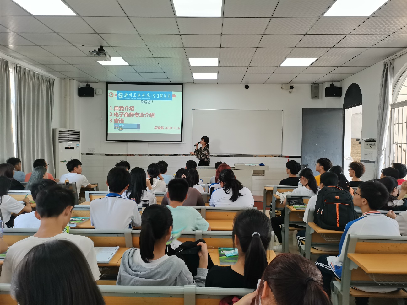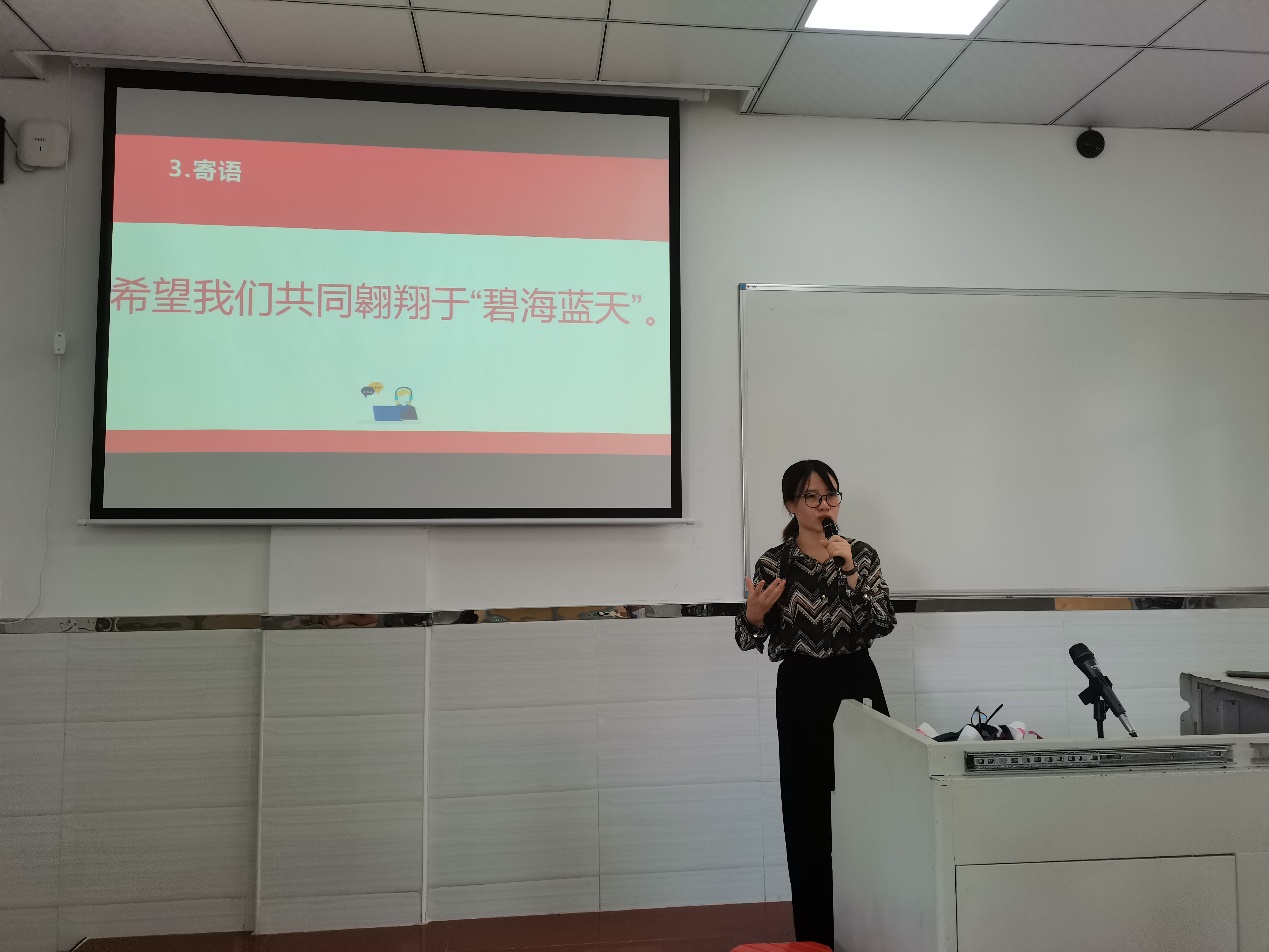 2020年11月6日,20级电商B4班于教学楼511开展了由班主任吴海娜举行的主题教育。会议主要内容:吴老师简单的自我介绍;电子商务专业的解说;对电商B4集体的美好寄语。会议中,吴老师强调了专业竞赛是一个很好的锻炼的机会,同时希望作为新生的我们勇于尝试去参与去磨练自己去丰富我们的人生阅历!会议同时也讲到关于论文的发表的问题,写论文是我们大学必不可少的一项而任务,吴老师分享了一个网站供同学们学习或发表论文的网站,希望同学能好好利用。会议结束前,吴海娜班主任给予电商B4班全体成员一句寄语:希望我们共同翱翔于“碧海蓝天”。台下同学们一片热烈的掌声表示对吴老师的喜爱,同时保证不会辜负吴老师的信任和期待!
