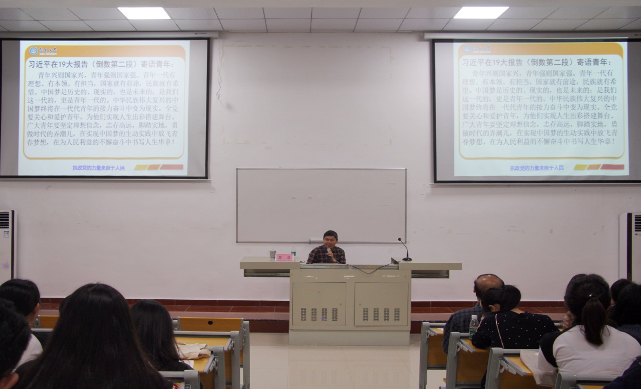 会上,夏泉书记别开生面以毛泽东主席曾说的“共产党人好比种子”一句话开局,引发学生深入思考。接着从自己独特的视角为大家论述中国共产党身处中国百年不遇之变局何以夺得政权?何以从革命党转型为执政党?最终归结于党的人民性。讲座过程中,夏泉书记特意为大家介绍了习近平总书记自党的十八大以来深入群众,脚步踏遍祖国各个贫穷落后的角落,从而让大家更真切的体会到共产党全心全意为人民服务的宗旨,人民是共产党的立党之本,执政之基,力量之源。
