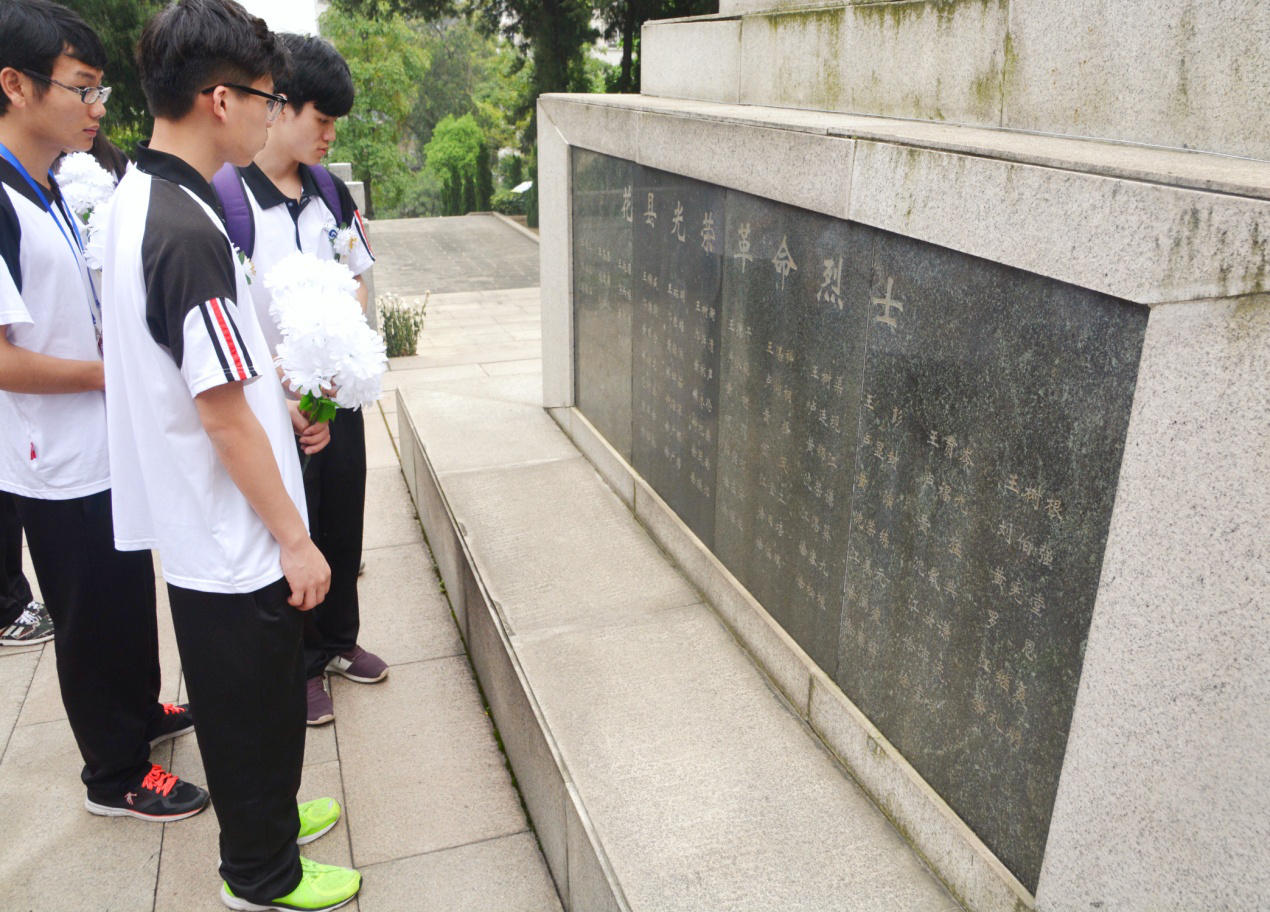 所有参加扫墓的师生乘车到达烈士陵园后,在辅导员老师的带领下徒步进入烈士陵园,在党务站谭浩辉同学的主持下扫墓活动正式开始。首先,全体党员在烈士墓碑前低头鞠躬并默哀,寄托对烈士的哀思,在为烈士们敬上装载着崇敬之意的花圈之后,同学们低吟致悼词来表达心中那份对先烈的沉重情感,以示对先烈们的缅怀和敬意。然后由学生党员代表邹雅文同学为大家讲述花都英烈们为了全国人民的解放,为了保卫和建设富强的社会主义祖国,英勇奋战、前赴后继,抛头颅扫热血的英雄事迹,在讲解中,仿佛重现了血雨腥风的战争岁月,中华民族的优秀儿女们为了人民的幸福生活,不惜抛头颅,洒热血的场景。最后由党务站谭浩辉同学领誓,在纪念碑下重温入党誓词,并庄严承诺将努力学习,继承和发扬革命先烈的遗志,为祖国的建设和发展奉献自己的青春和热血。