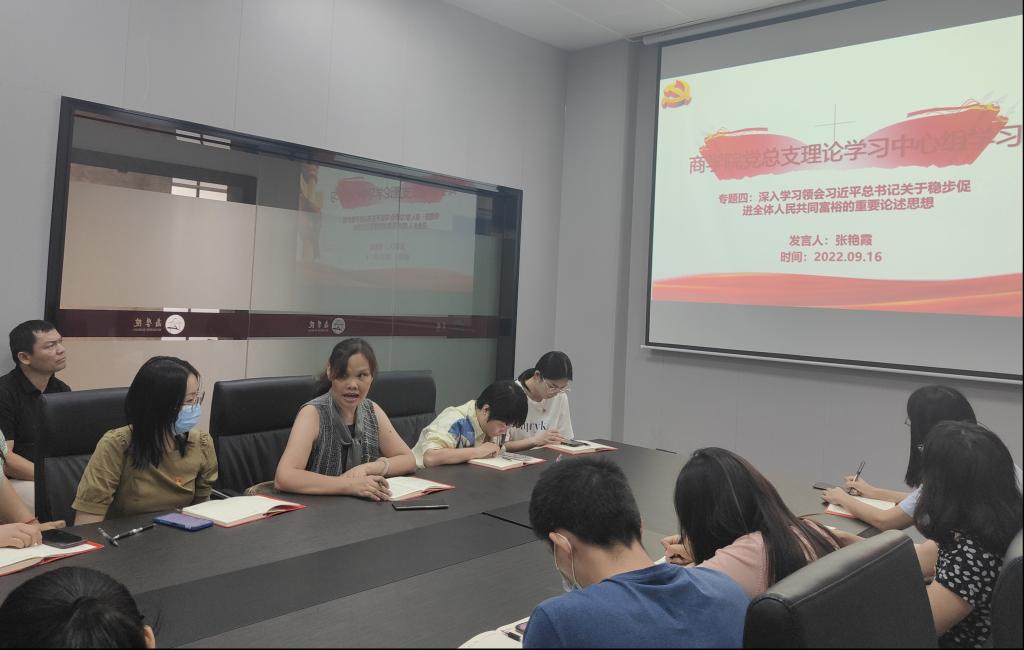 2022年9月16日下午,商学院党总支理论学习中心组于商学院618会议室组织商学院党员同志进行“深入学习领会习近平总书记关于稳步促进全体人民共同富裕的重要论述”专题学习。本期专题学习由教工第二党支部书记尤彧聪同志牵头做专题学习报告。
