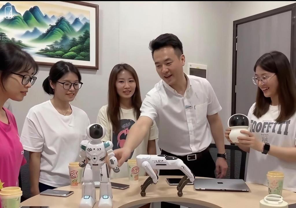 交流环节,张华杰老师对文编荟的精心安排表示感谢,并回顾了双方合作历程。他指出,校企共建的校外实践基地已成为学生接触行业前沿、检验理论知识的“第二课堂”。在产教融合实践中,学生们在企业导师与校内导师的"双导师"联合指导下,对"智玩谷"项目展开沉浸式实战淬炼。通过百余次方案迭代优化,从市场定位到营销策略进行全流程打磨,切实推动了学生新媒体营销、数据分析和创意执行能力的多维提升。交流环节特别设置了产品体验环节,学生们近距离观摩了"智玩谷"研发的AI编程教育机器人及四足机器狗,通过人机交互实操、模块化编程体验及智能避障功能测试,直观感受文化科技产品的研发逻辑与技术创新。学生代表封同学在活动后表示:“通过实地参观和岗位解读,我对电子商务新媒体行业有了更清晰认知,对即将到来的实习充满期待,希望能将所学知识转化为实际成果。”