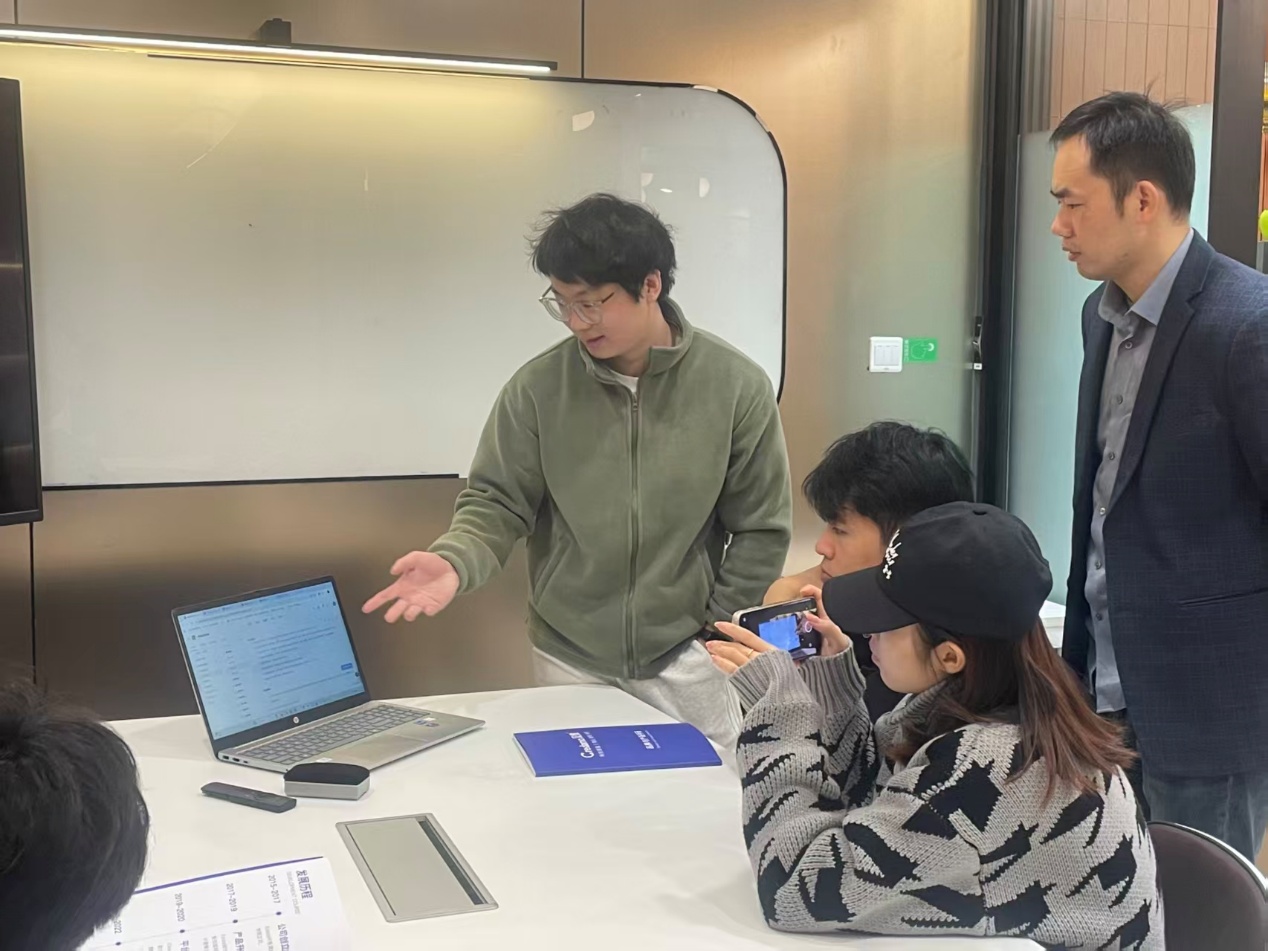 在公司代表陪同下,师生一行深入参观了产品演示中心与研发办公区。技术专家展示了其核心的一站式智能调研平台:从问卷设计、精准投放到在线随机实验、多期追踪数据回收,全流程高效闭环。工作人员阐释了平台如何通过严谨的实验设计与高质量数据回收,支撑师生开展达到国际期刊标准的学术研究,并覆盖管理学等多学科交叉课题。