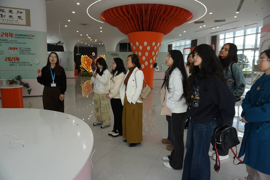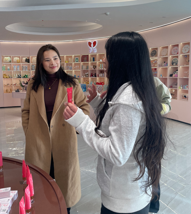 在企业参观环节,芭薇公司精心安排了参观路线,带领师生依次走访了一楼专利荣誉墙、二楼产品展厅、三楼销售研发中心以及四楼生产车间、八楼检验中心。通过实地观摩与讲解,师生们深入了解了企业的研发实力、生产流程、产品体系以及市场运营模式,对化妆品行业的发展现状与数智营销的实际应用有了更直观的认识。