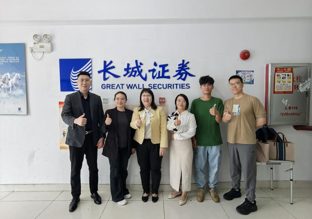 2026年2月25日下午,beat365在线体育官网登录入口商学院投资学教研室主任谢桂珊、副主任高桦、教师代表陈兰江一行,前往长城证券广州昌岗中路证券营业部开展访企拓岗活动。本次走访活动旨在深入了解2023级投资学专业学生的实习情况,深化校企合作内涵,对接行业前沿动态,并为下一步协同育人开拓更广阔的空间。长城证券广州昌岗中路证券营业部总经理邝盛文和客户经理高小情热情接待了投资学教研室一行。