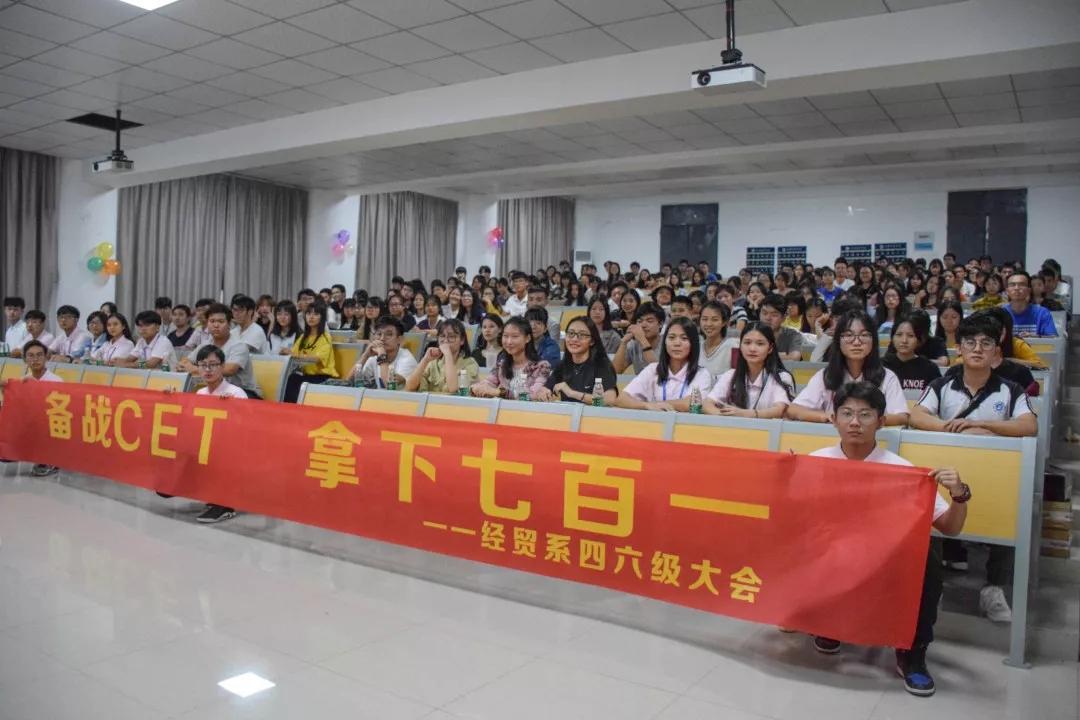 为积极响应我院邝邦洪院长提出的 “以德为行,以学为上”教育思想,积极践行“五进”教育实践之“进课室”及“进图书馆”,同时为提高同学们的专业素养,激发同学们学习英语、应用英语的兴趣。我系特于11月14日晚上19时在教学楼417开展“备战CET,拿下七百一”2018经贸系大学英语四六级交流大会。