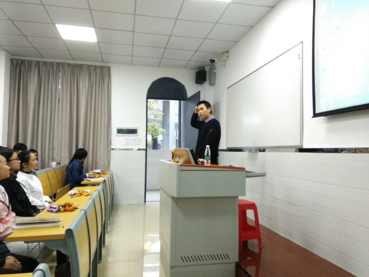 座谈会上全佺老师跟同学们讨论了关于做人的诚信、道德的问题,在最后,提出了两个问题,一是励志奖学金对自己的帮助、二是如何回报国家,三名同学认真地回答了问题并说出自己的未来规划。