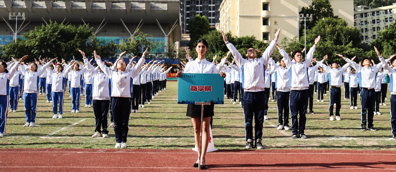 在开幕式表演中,由商学院学子组成的广播体操代表团在运动场上进行比赛,整齐划一、的动作展现出商学院学子的飒爽英姿。