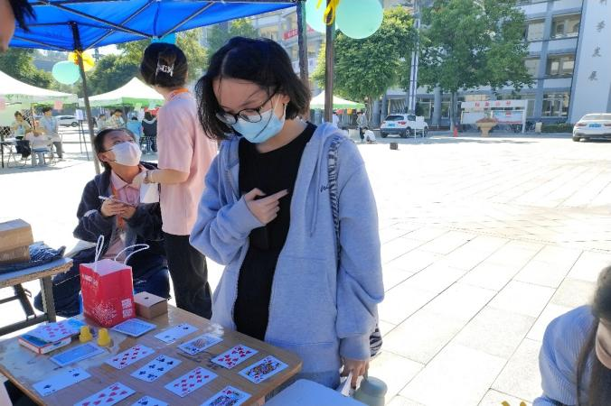活动从系黄丝带开始,一条条黄丝带缠绕在手边,诉说着人与人的情谊;在系黄丝带的右边,便是感恩线。感恩线上寄托着期盼与美好的祝愿,许愿之人将心愿写在小卡纸上,将它挂在感恩线上,卡纸随风飘扬,让美好的祝福随风送去给所爱之人;从系黄丝带的左边放眼望去,明信片上的图片绚丽多彩,独一无二的故事,抒发着自己的情感;还有同学把自己的祝福写在纸上,投入漂流瓶中,再从里面抽走一张陌生人对自己的祝福。