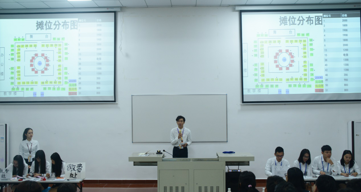 本次拍卖会由学习部部长隆梓旋作为拍卖师主持摊位拍卖,拍卖师给各位竞拍者展示了摊位竞拍图并介绍摊位的种类及价格,清楚地说明了竞拍规则。