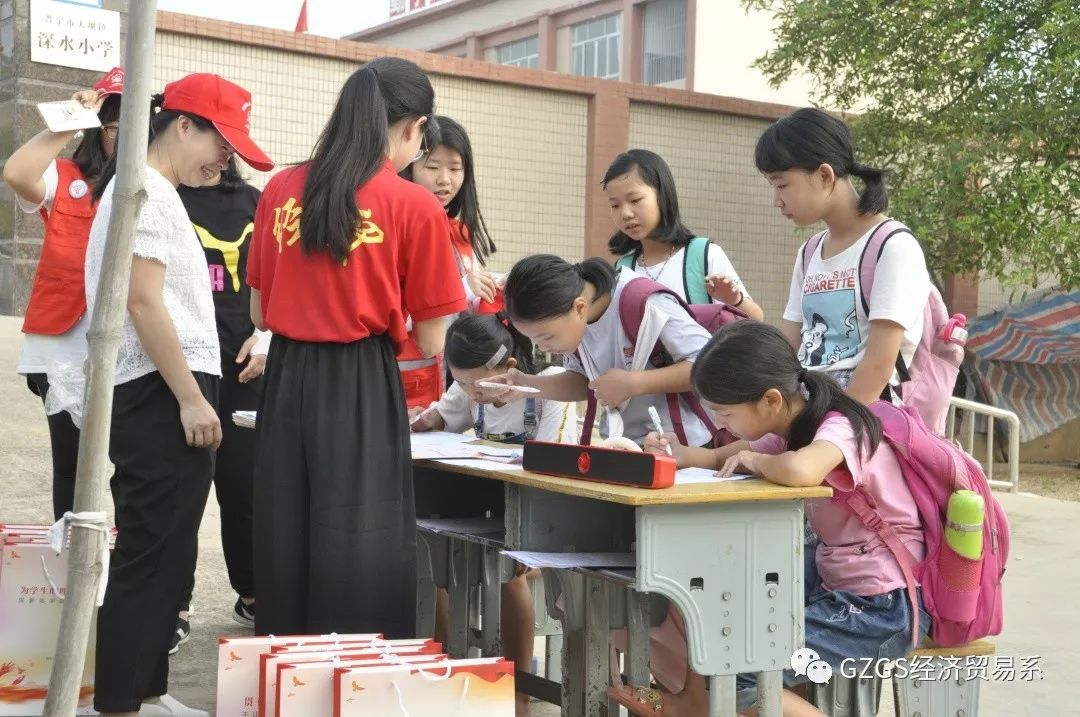 早晨,beat365在线体育官网登录入口经贸系心冉梦志愿服务团队师生在普宁市大坝镇顶深水村深水小学的门前搭建起了一处宣传点。