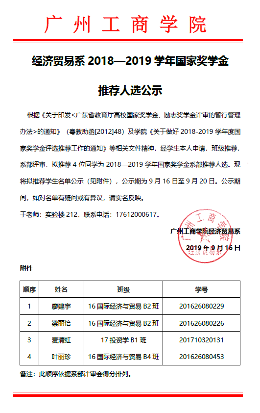 经过紧张的计分后,经济贸易系2018-2019学年国家奖学金结果正式公布廖建宇、梁丽怡、麦清虹、叶丽珍获得本系推荐名额。