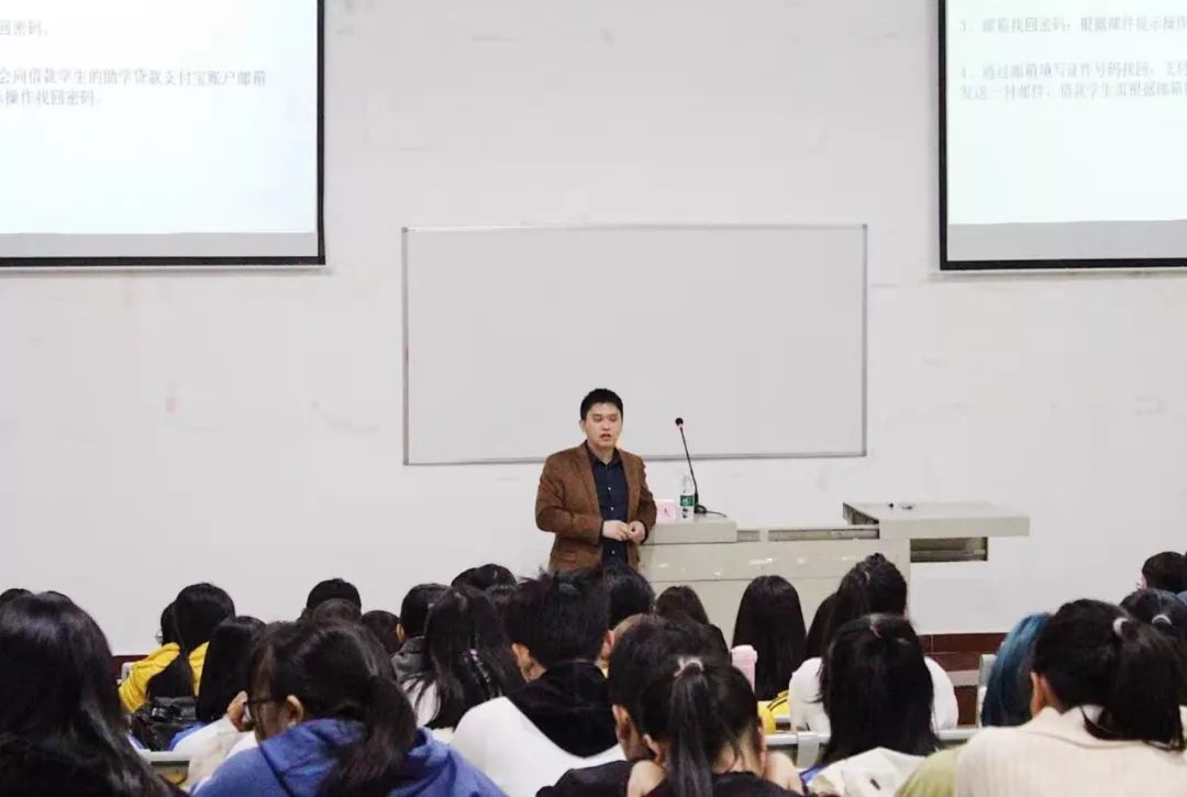 本次讲座共分为两场,第一场主题讲座于12月4日16:45分在教学楼517举行,由资助小组全佺老师主讲。第二场主题讲座于12月10日19:00在实验楼101举行,由资助站钱盼红老师主讲。老师们希望通过此次讲座,为同学们认识助学贷款打开一扇窗,树立牢固的诚信意识,明确自己的还贷责任。