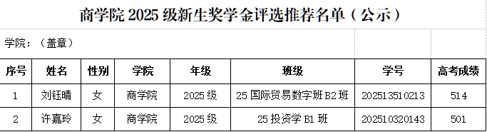 附件:商学院2025级新生奖学金推荐名单(公示)