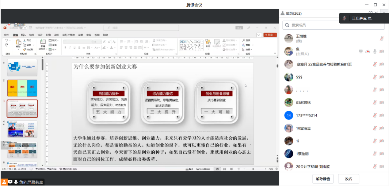 本次讲座的主要内容是互联网+大赛深度解读、典型项目案例分析、创新创业项目PPT制作以及商业计划书撰写技巧,邀请了两位重量级嘉宾(分别是顾蔚坤总经理和王乾总经理)到达现场分享。由于讲座是在三水校区举行,国贸教研室领导组织全体老师线上观看,并将自己认为最有用的知识点通过截图保存分享。另外,为落实参赛队伍指标,教研室还要求本学期讲授《创新创业训练》的老师以及全体班主任都要参加项目指导过程。