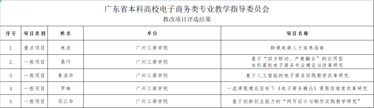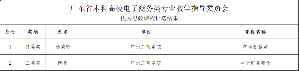 近日,广东省本科高校电子商务类专业教学指导委员会公布了《2022年广东省本科高校电子商务类专业教学改革项目》和《2022年广东省本科高校电子商务类专业教学指导委员会优秀思政课程》评审结果,我院获批重点项目一项,获批一般项目四项;两门课程分别获评优秀思政课程特等奖和三等奖。其中,我院院长林波博士负责的项目——跨境电商人才培养指南获批为教改项目重点项目;我院教师杨美玲副教授负责的课程《市场营销学》获评优秀思政课程评选结果特等奖。