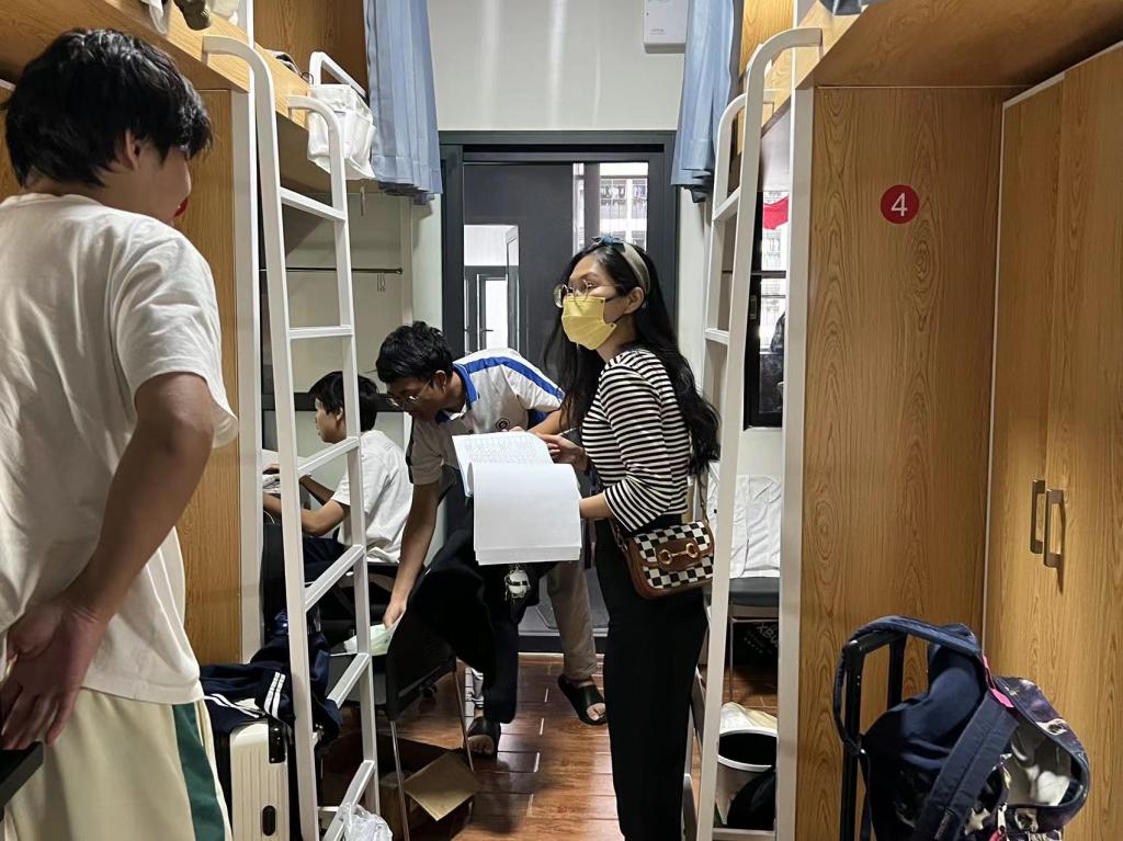 “学生在哪里,辅导员就在哪里。”次日,在接到学校召回命令的时候,家住校外的辅导员一边线上安抚学生,一边刻不容缓赶赴回校园一线,全身心投入校园封闭状态下的学生管理工作中。为充分了解校园封闭下同学们的在寝生活以及需求,即时疏导学生可能出现的焦虑、烦躁等情绪,商学院辅导员群策攻艰,时常结伴深入学生寝室,将目前校内外疫情防控形势和学校的管理办法向每一位同学耐心解释,同时也认真倾听学生们面临的问题和需求,积极安抚学生情绪,关注做好学生的心理疏导工作。