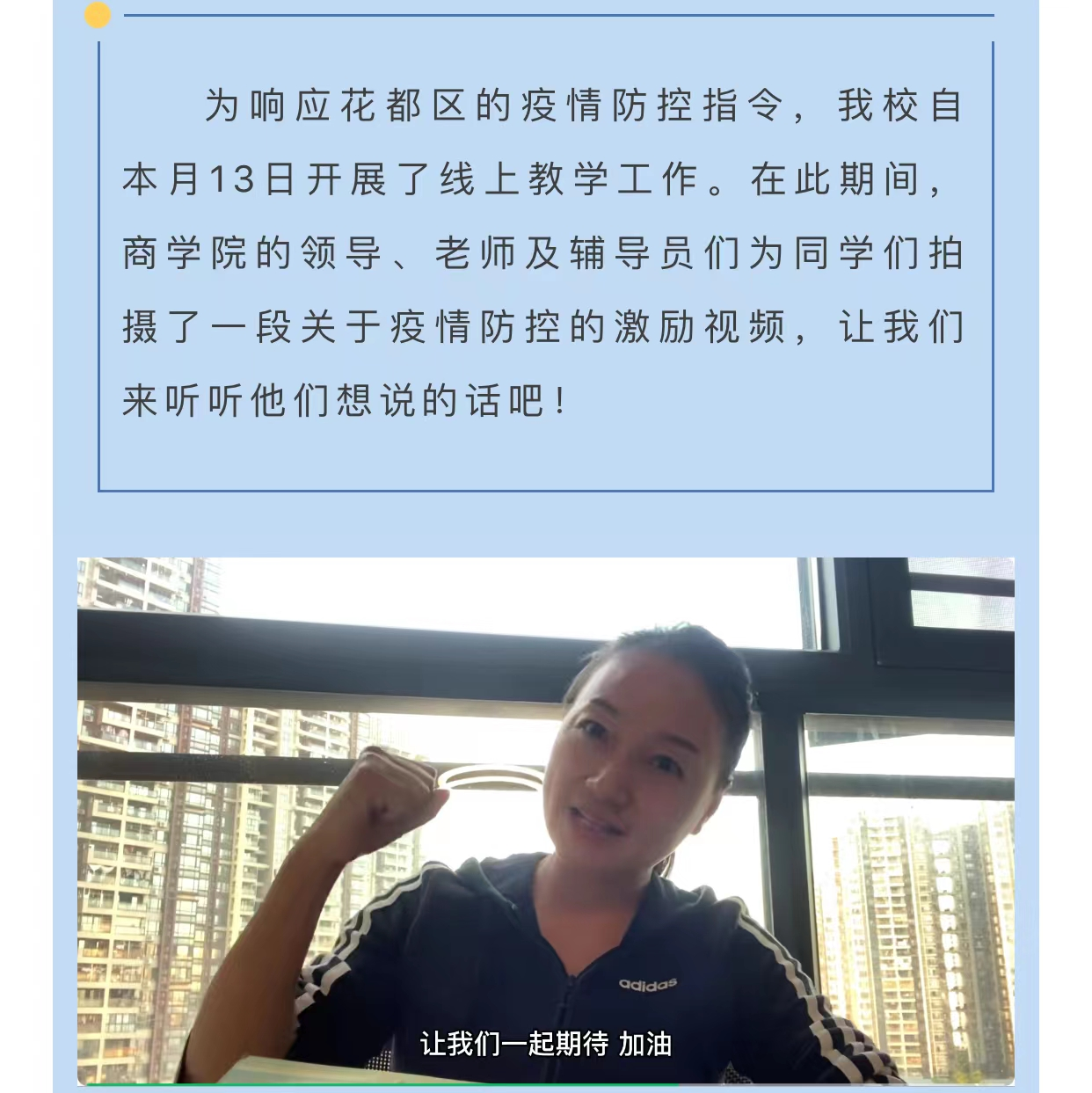 此外,自10月13日学校进入封闭管理以来,家住小区因封控无法返校返岗的学院领导、辅导员以及班主任们也纷纷通过云视频给所有在校学生加油、打气,给同学们信心,相信只要满载希望与爱,同心战“疫”,我们终会战胜疫情,迎来冬日里,暖暖的阳光。