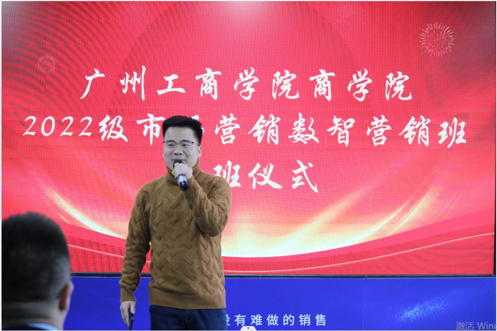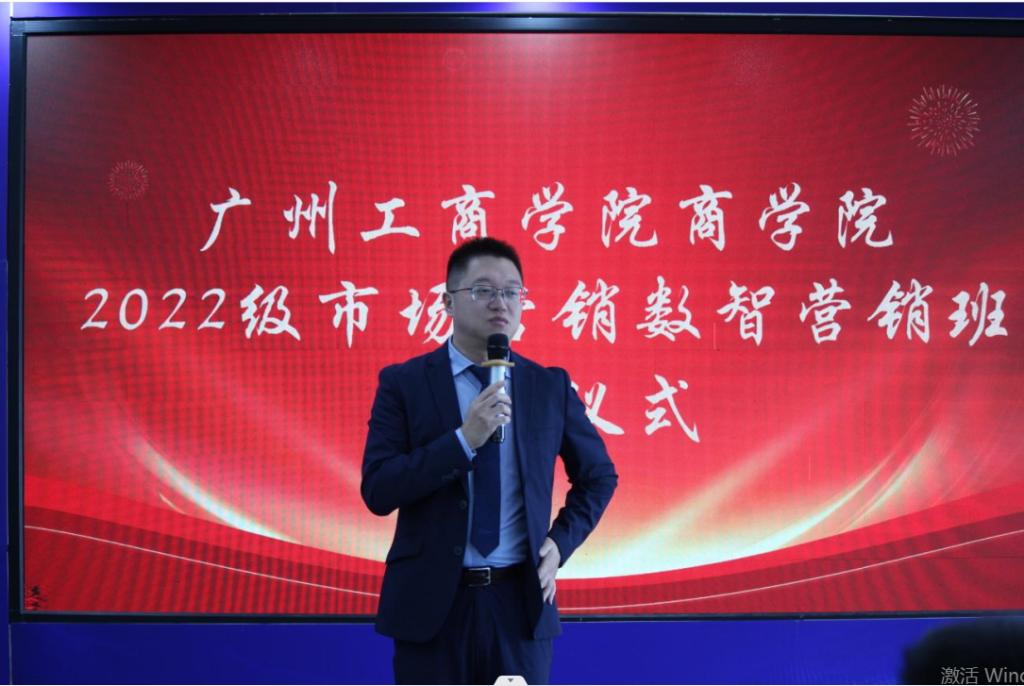 广州探迹科技有限公司执行董事潘寿璋先生做开班致辞,他向数智营销班的各位同学分享了他大学时期艰苦创业的实践过程。实践出真知,正是大学生涯的创业实践给后期打下坚实的基础,探迹公司也是在一步一步的探索中逐渐成长起来,目前发展成为广州市的主要企业,也是全球的独角兽企业。最后潘总表达了对各位同学美好的期望,也希望大家在大学几年里面能好好规划一下自己未来的方向。