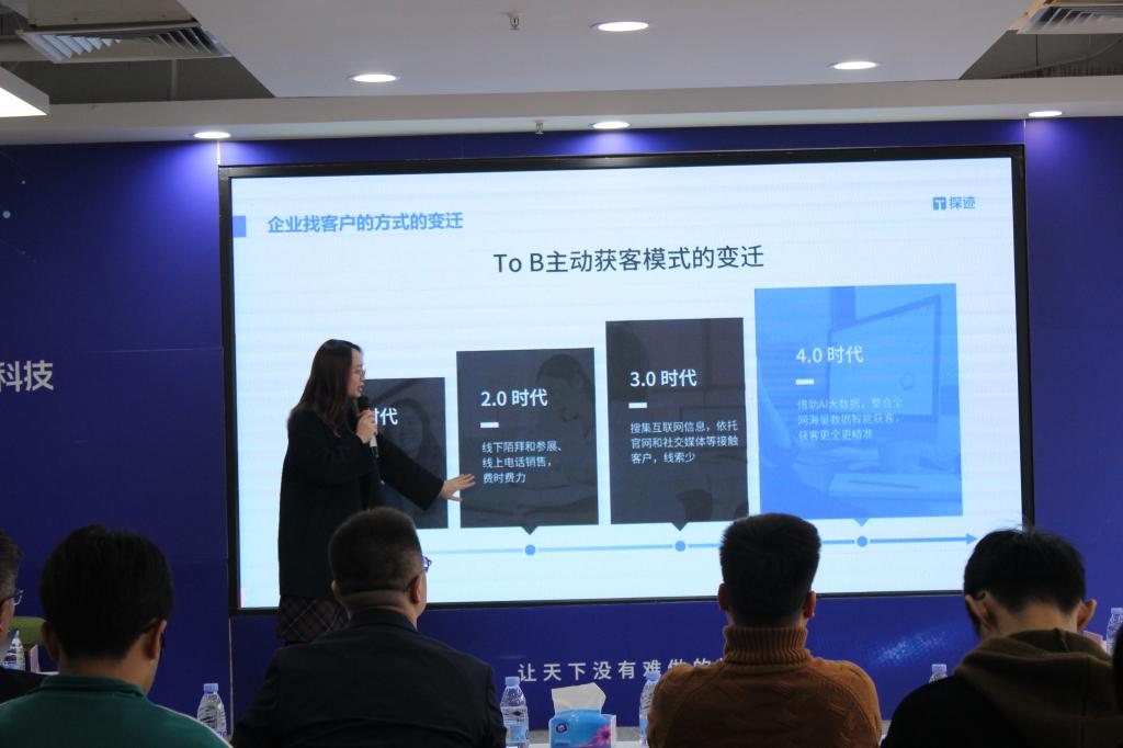 人力资源总监何荟茹介绍了广州探迹科技有限公司的具体情况和创建理念,探迹(Tungee)是国内的智能销售服务提供商,用大数据和人工智能(AI)技术帮助企业提升销售效率。通过挖掘和分析全网信息,构建出超一亿家企业和上万个分析维度的企业知识图谱,并在此基础上结合NLP、机器学习算法等人工智能技术,打造出探迹智能销售云平台和智能销售解决方案,帮助企业提升销售效率。时至今日,探迹已经服务了超过2万家企业,帮助他们实现数字化转型。