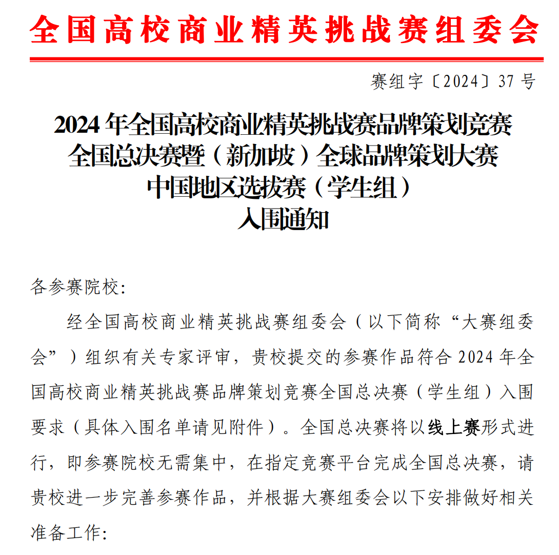 此次竞赛beat365共有85名同学参加并通过知识竞赛,一共组建了24支参赛团队,最终提交了12个参赛作品参加省赛/全国预选赛。2024年4月18日,经全国高校商业精英挑战赛组委会组织有关专家评审,经国际贸易促进委员会评审公示,最终市场营销专业共计6个团队作品入围国赛。