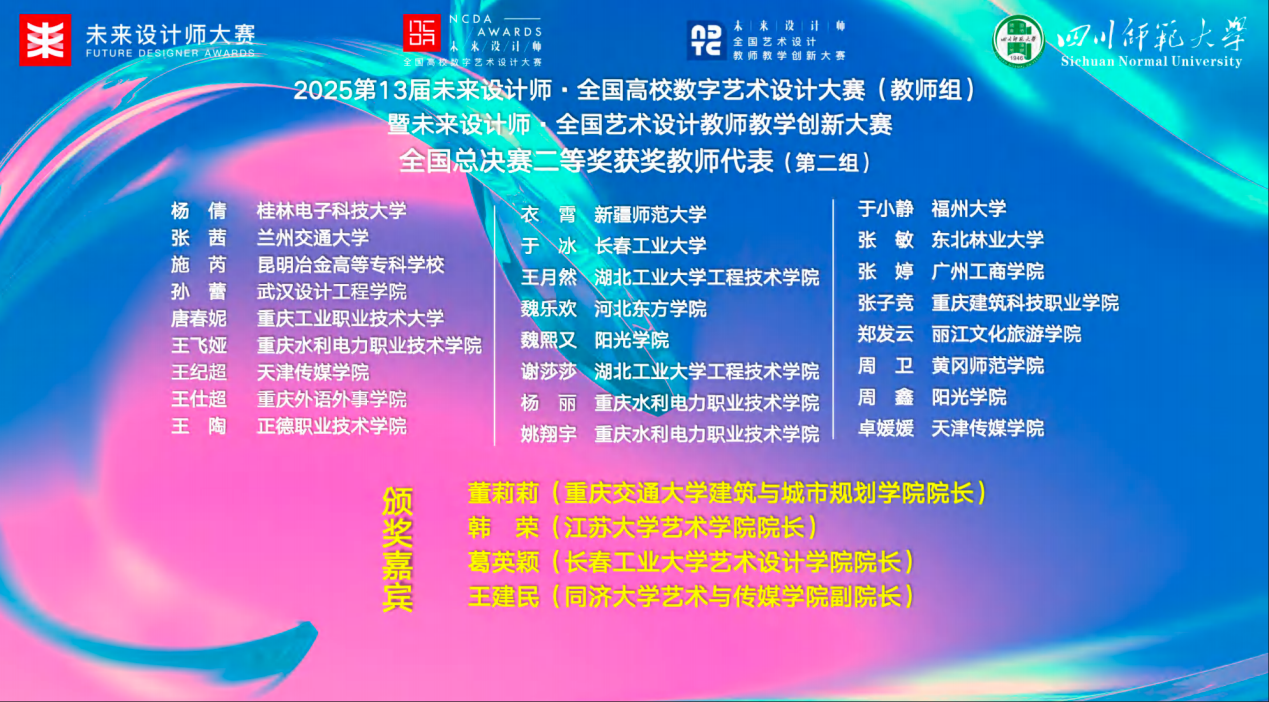 11月22日至24日,全国总决赛在四川成都正式开赛。作为国内艺术设计学科领域的重要赛事,本届大赛竞争格外激烈,吸引了来自全国416所高校的1066支参赛队伍、5186名教师同台竞技,赛事覆盖29个省(自治区、直辖市)赛区。值得关注的是,“未来设计师・全国艺术设计教师教学创新大赛(NDTC)”已入选教育部中国高等教育学会教师教学竞赛排行榜,获多家教育厅发文立项支持,自2012年起每年举办一届,至今已连续成功举办12届,采用“校赛-省赛-国赛”三级赛制,是高校艺术设计类教师公认的权威、公正赛事平台,其优秀成果多次获 “学习强国” 学习平台、半月谈等权威媒体专题报道与展示。