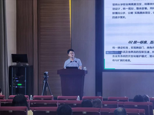 最后,刘育旺副主任从现阶段校园信息化的建设成果、学校信息化的主要问题、总体思路与主要目标、主要任务与改革举措、保障措施与规划实施等五个方面系统介绍了学校过去五年在教育信息化、智慧校园建设方面取得的成绩和面临的问题,并详细介绍了学校“十四五”校园信息化建设规划思路。