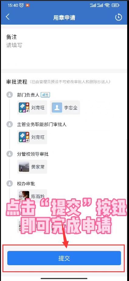 4、信息填写完整,点击“提交”按钮,等待审批人审批。