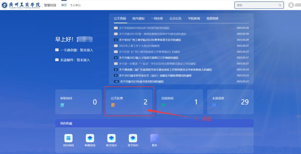 电脑登录融合服务门户,点击-“个人中心”,找到公文查阅模块,点击-“更多”进入公文查阅页面,如图所示: