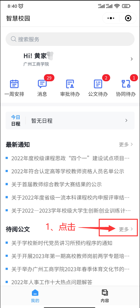 从企业微信-“工作台”进入融合服务门户,找到待阅公文模块,点击-“更多”进入公文查阅页面,如图所示: