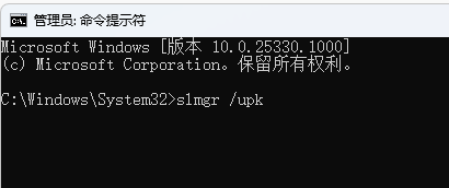 3)在弹出对话框中输入:slmgr /upk,卸载秘钥(图1-3)。